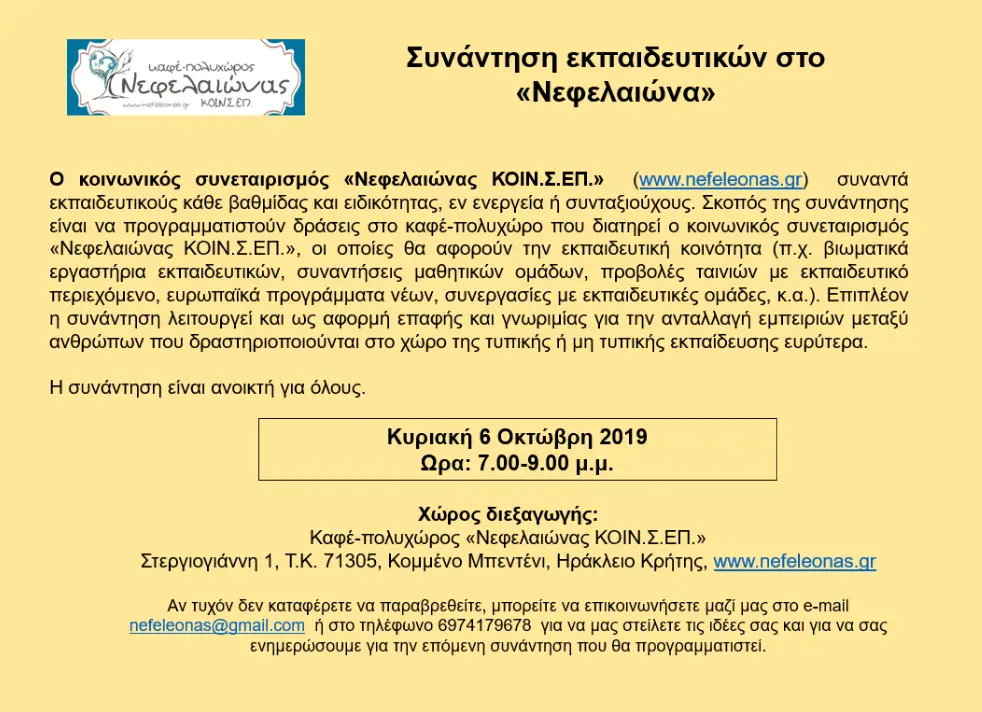 Ο κοινωνικός συνεταιρισμός «Νεφελαιώνας ΚΟΙΝ.Σ.ΕΠ.» (www.nefeleonas.gr) συναντά εκπαιδευτικούς κάθε βαθμίδας και ειδικότητας, εν ενεργεία ή συνταξιούχους. Σκοπός της συνάντησης είναι να προγραμματιστούν δράσεις στο καφέ-πολυχώρο που διατηρεί ο κοινωνικός συνεταιρισμός «Νεφελαιώνας ΚΟΙΝ.Σ.ΕΠ.», οι οποίες θα αφορούν την εκπαιδευτική κοινότητα (π.χ. βιωματικά εργαστήρια εκπαιδευτικών, συναντήσεις μαθητικών ομάδων, προβολές ταινιών με εκπαιδευτικό περιεχόμενο, ευρωπαϊκά προγράμματα νέων, συνεργασίες με εκπαιδευτικές ομάδες, κ.α.). Επιπλέον η συνάντηση λειτουργεί και ως αφορμή επαφής και γνωριμίας για την ανταλλαγή εμπειριών μεταξύ ανθρώπων που δραστηριοποιούνται στο χώρο της τυπικής ή μη τυπικής εκπαίδευσης ευρύτερα.