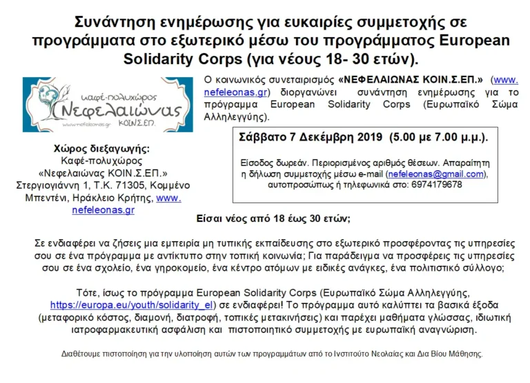 Ο κοινωνικός συνεταιρισμός «ΝΕΦΕΛΑΙΩΝΑΣ ΚΟΙΝ.Σ.ΕΠ.» διοργανώνει συνάντηση ενημέρωσης για το πρόγραμμα European Solidarity Corps (Ευρωπαϊκό Σώμα Αλληλεγγύης).