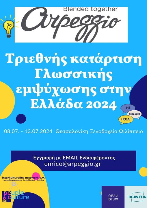 Δηλώστε συμμετοχή στο πρόγραμμα βασικής εκπαίδευσης για τη γλωσσική εμψύχωση το οποίο υλοποιεί ο συνεργάτης μας, ο κοινωνικός συνεταιρισμός ARPEGGIO, στη Θεσσαλονίκη, το διάστημα 8-13 Ιουλίου 2024!